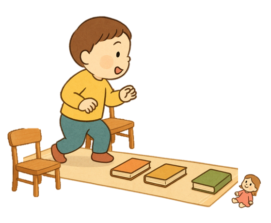- 두꺼운 책이나 상자 놓아 징검다리 만들기 (조심조심 건너기)