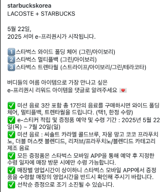 - 혜택: 스타벅스 X 라코스테 한정 굿즈 제공